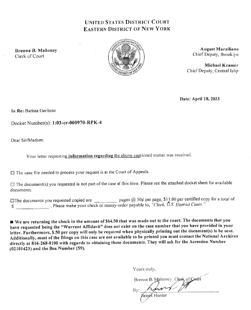 Subject: Request for Archived Federal Court File – United States v. Battista Geritano, EDNY 03-CR-970 / Accession No. 02101423 / Box No. 59