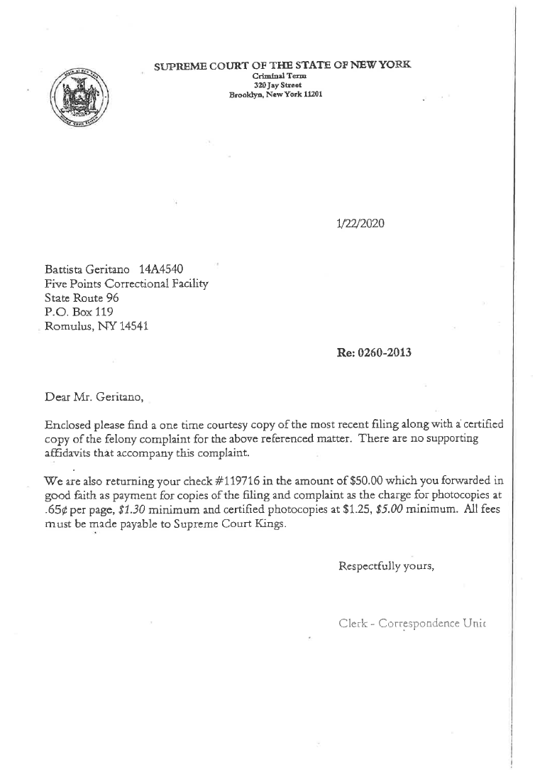 Re: Certified Copy Request – People v. Battista Geritano, Ind. No. 260/2013