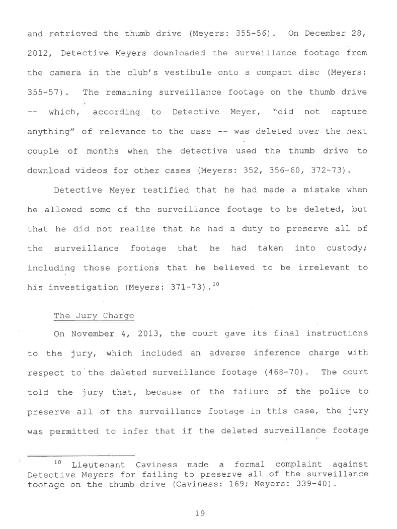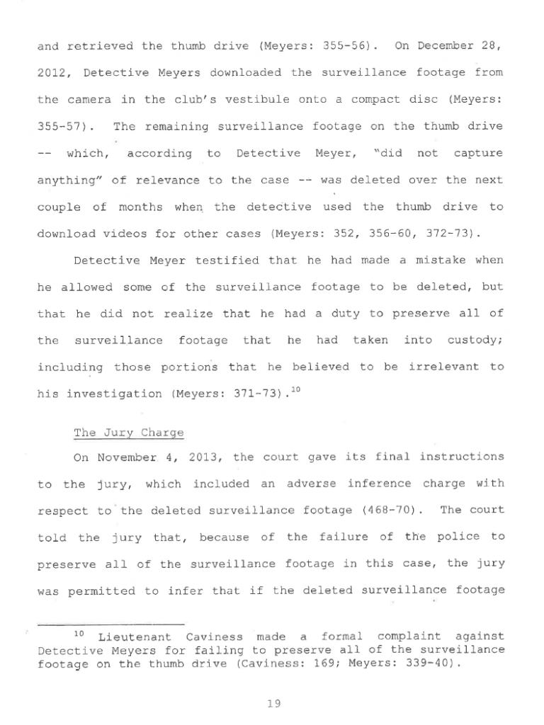 On p. 10, Meyers says he saved only the vestibule portion because it was “the only part” he needed and did not save the bar-area material; on p. 41, a later prosecutor’s affirmation acknowledges he allowed some surveillance to be deleted and notes Lieutenant Caviness complained about that failure. The Appellate Division still rejected the defense claim on appeal, but as a reporting matter, this is strong because it is not speculative — it is an admitted process failure.