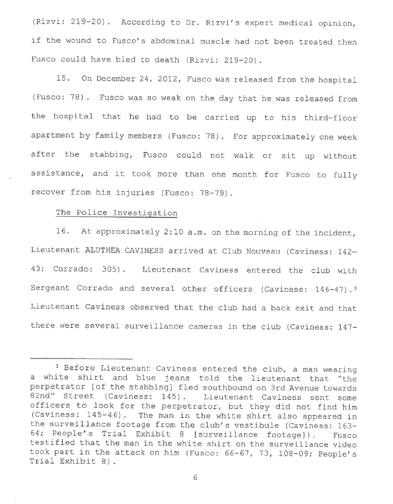 Fusco later testified that he didn’t even realize he’d been stabbed until bouncers broke up the fight and led him outside. He underwent emergency surgery for serious wounds, including a punctured lung and a deep forearm gash.