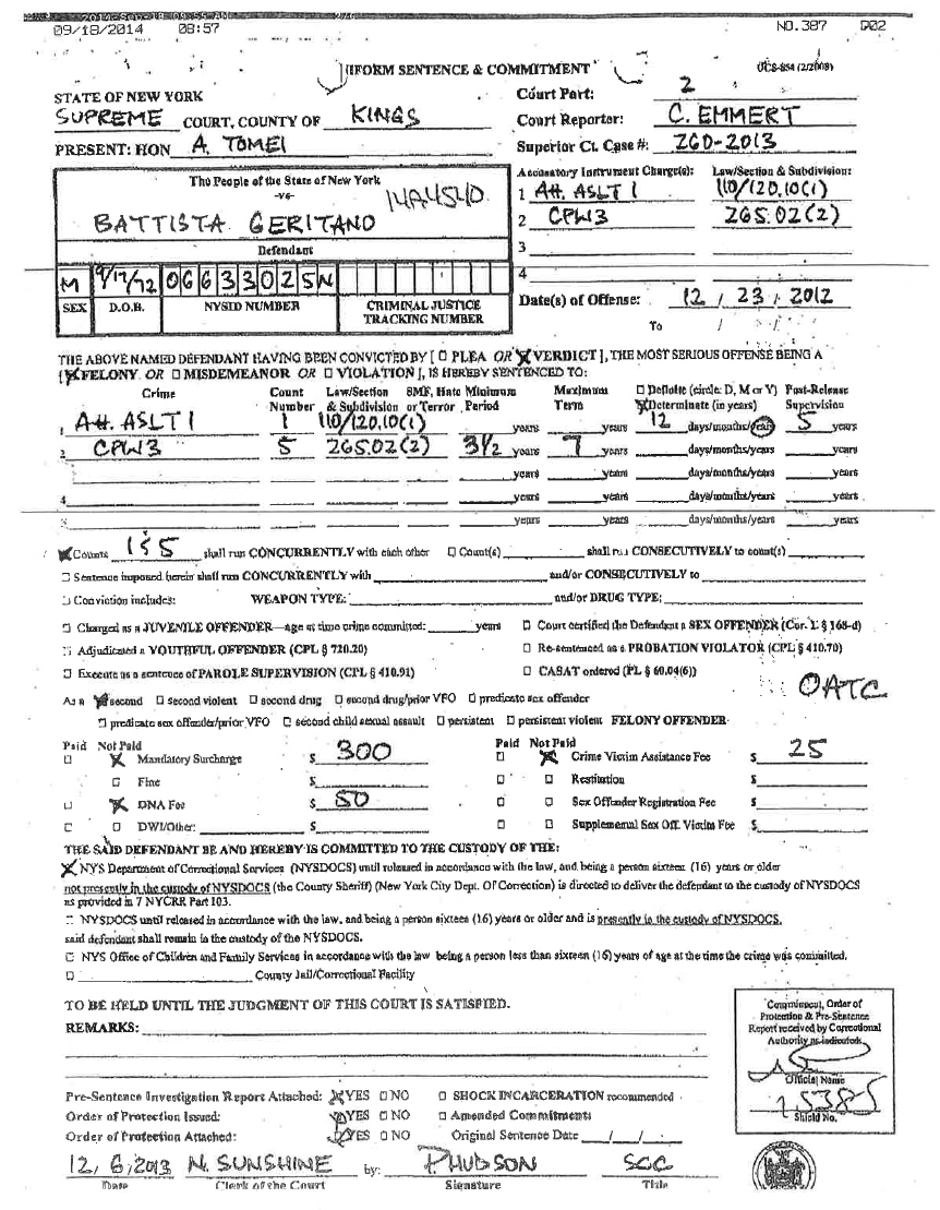 Subject: Certified Copy Request – People v. Battista Geritano, Ind. No. 260/2013