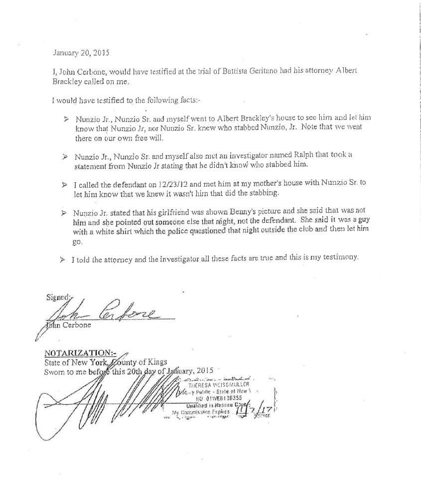 The Evidence Book gives multiple pages for this: p. 5 (Shasho), p. 9 (Cerbone), p. 42 (man in white shirt in police/prosecutor recounting), and the later handwritten packets. The federal order confirms that Geritano later submitted Shasho, Cerbone, Kornhaber, Nackab, and Polanco/Fusco materials, but Judge Kovner held that those submissions still did not outweigh the evidence used against him. So this is a strong “ignored lead / weak corroboration / why wasn’t it run down harder?” angle.