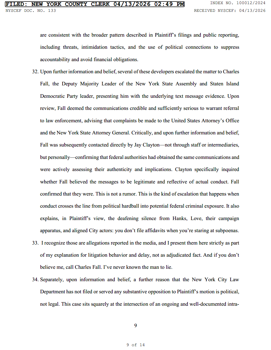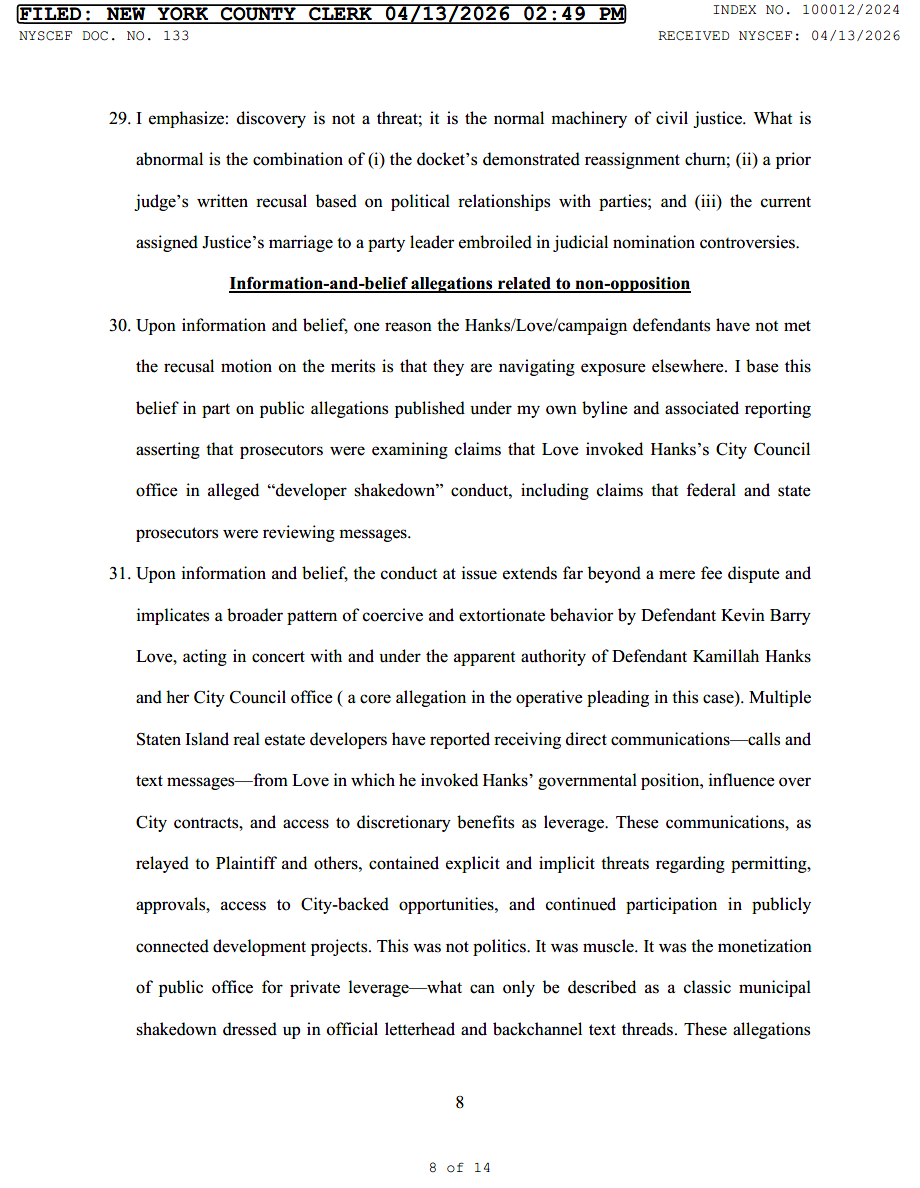 He ties that silence to public allegations that Kevin Barry Love used Kamillah Hanks’s City Council office as leverage in a developer shakedown scheme. The filing says multiple Staten Island developers reported calls and texts from Love invoking Hanks’s government position, influence over city contracts, access to benefits, and power over approvals.