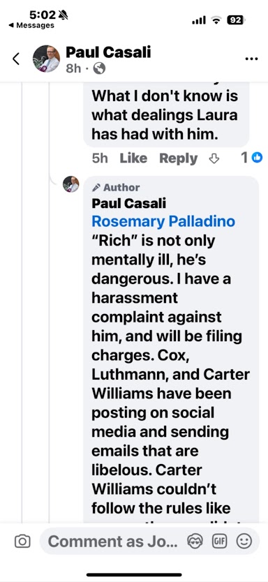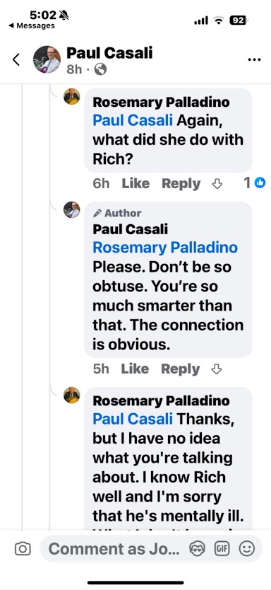In one Facebook exchange, Casali posted: “Rich is not only mentally ill, he’s dangerous. I have a harassment complaint against him and will be filing charges.” In another, he wrote, “He needs to be on medication.”